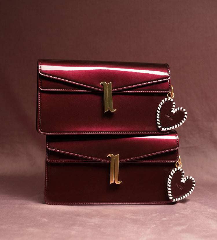 Made in a luxurious burgundy patent material, finished with a threaded heart charm. It’s your reminder that fate shows up, exactly when it’s meant to.