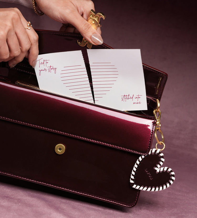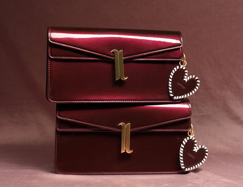 Inspired by the Red String Theory, the belief that invisible threads bind us to people, moments, and places meant for us. The bag has a burgundy patent finish, the look completed with a heart charm that’s gently held together by a white thread.